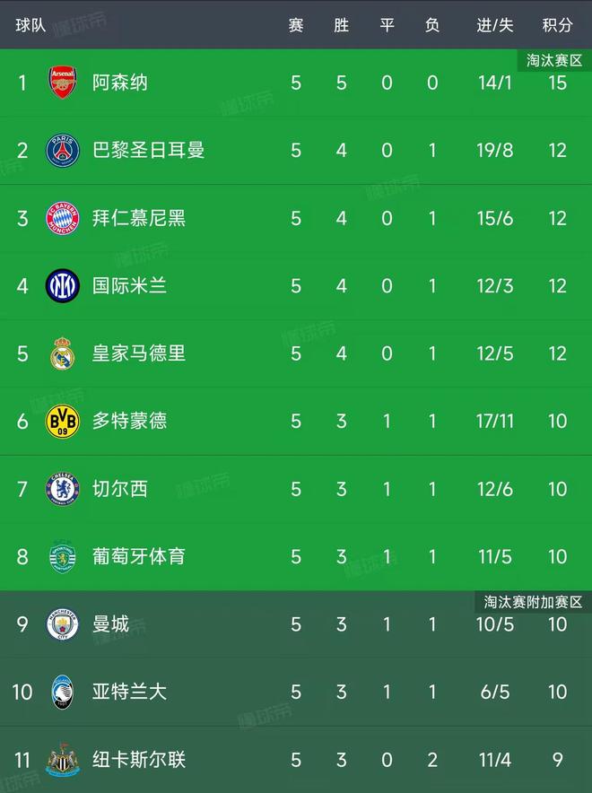 欧冠第5轮结束了所有比赛,最新积分榜如下!