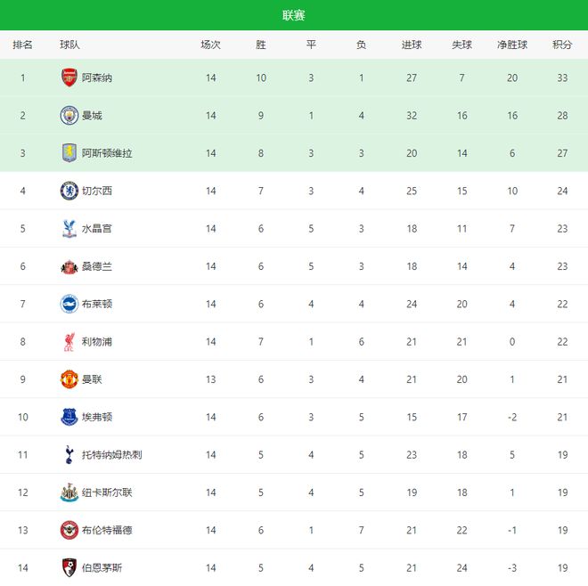 英超积分榜,阿森纳2:0,5分领跑,维拉让二追四,4连胜攀升第三